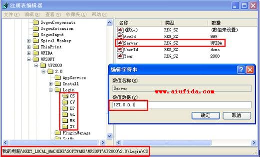 (1)点击桌面左下角的“开始”菜单- 选择“运行”- 输入“regedit”进入注册表编辑器,同时依次点击进入注册表路径:[HKEY_LOCAL_MACHINE\SOFTWARE\UFSOFT\UF2000\2.0\Login\]